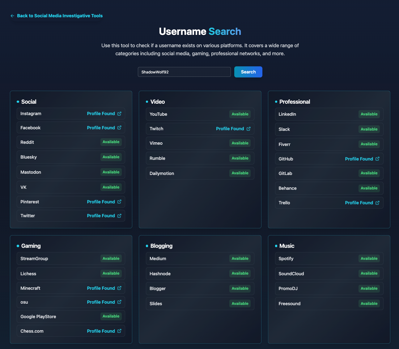 A username is often the first and most accessible data point in an investigation. Unlike emails or phone numbers, usernames are typically public and used on multiple services. This allows analysts to uncover: